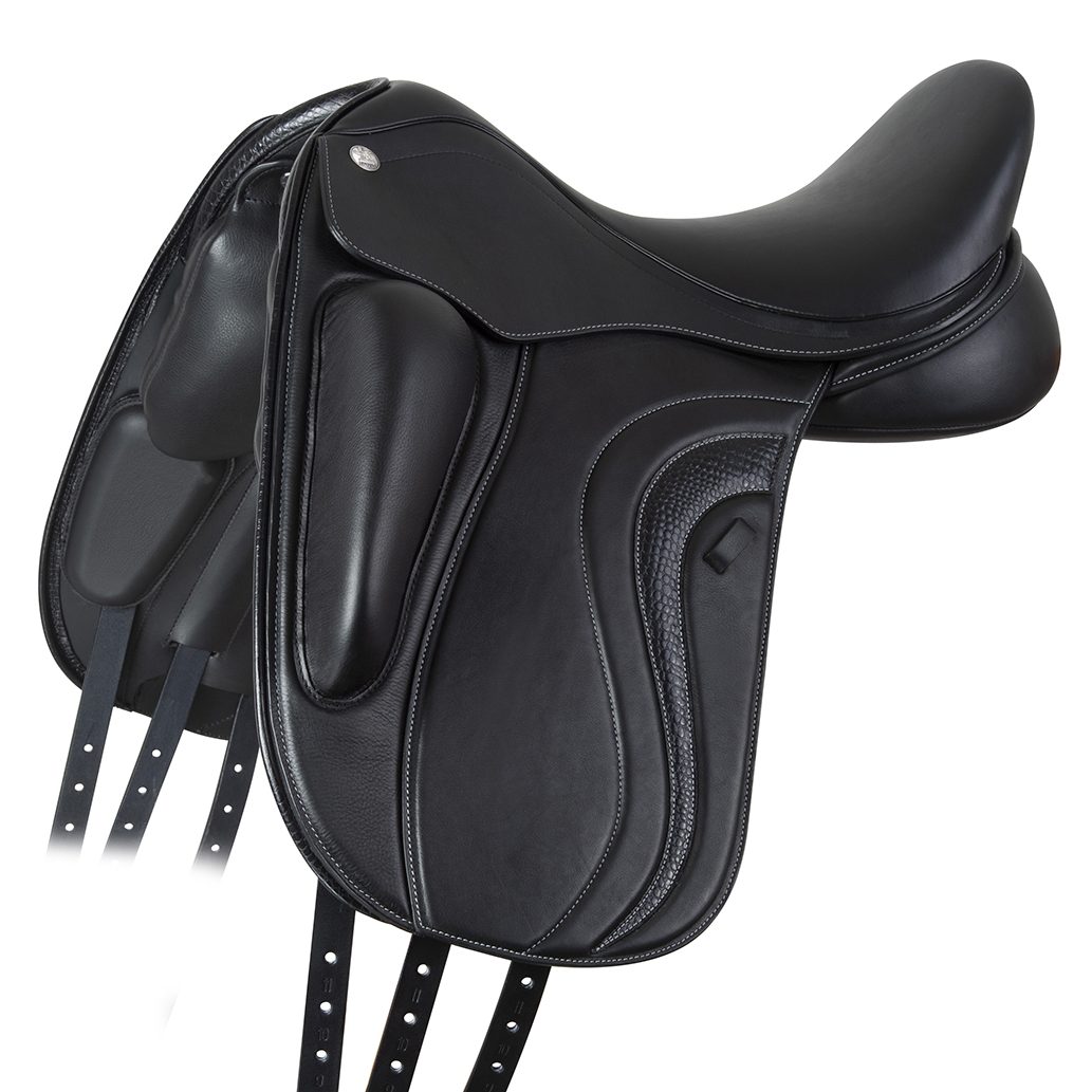 En dressyrsadel med djupaste punkten mitt i sadeln för att placera ryttaren rätt. Stora, utanpåliggande knästöd ger ordentligt med stöd. Framtagen tillsammans med Marc-Peter Spahn.