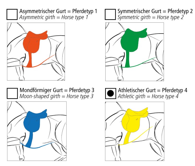 Resår och D-ringar på båda sidor samt karbinhake under magen. Asymmetrisk resår för att spännena vid ridning inte ska hamna ojämnt på grund av den rundade formen.