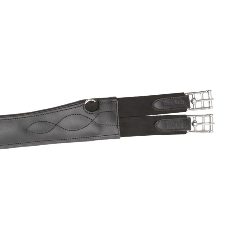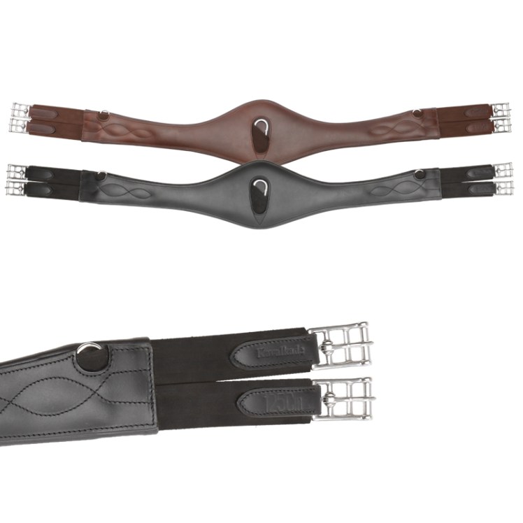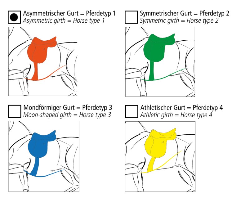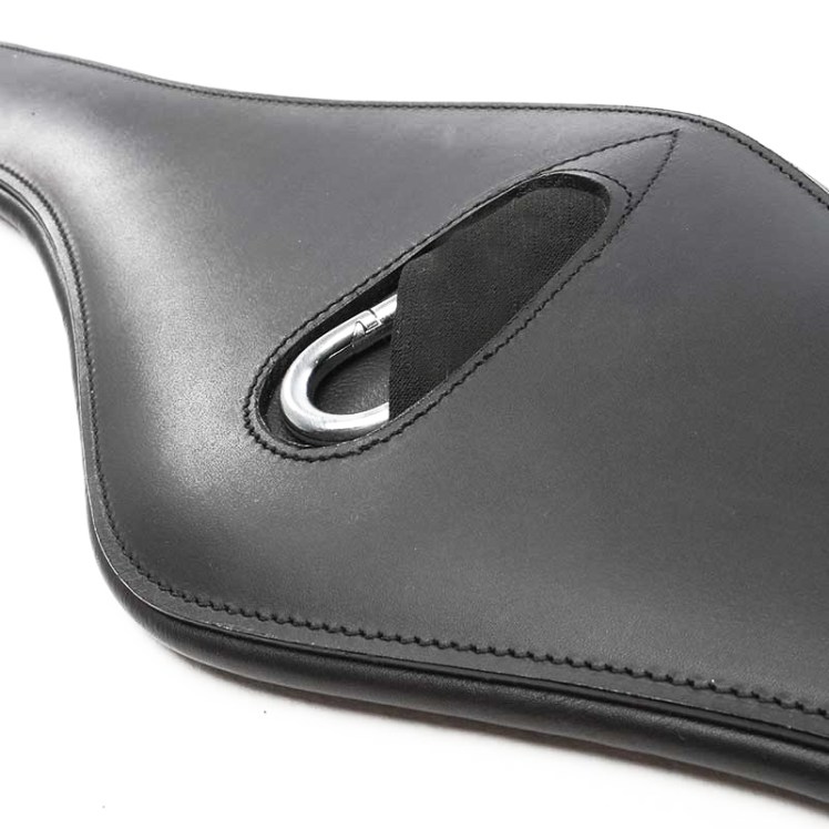 Anatomisk sadelgjord i oljat läder, utskuren för armbågarna och med bred platta under magen.