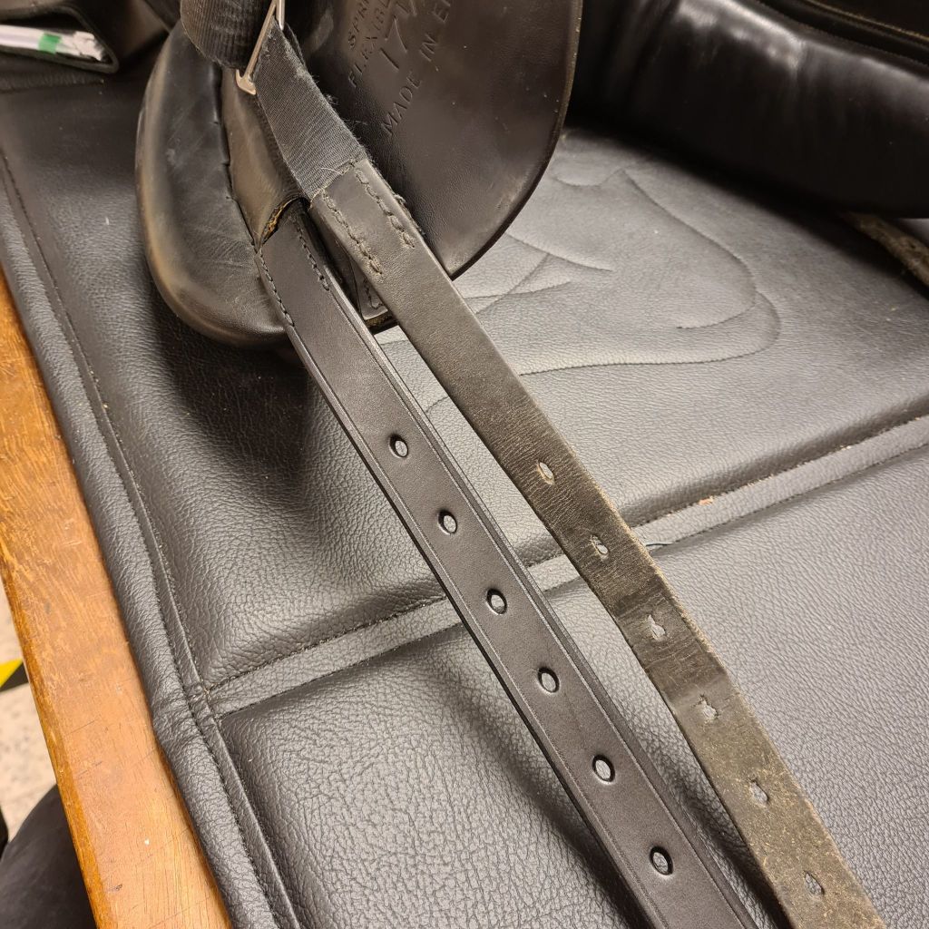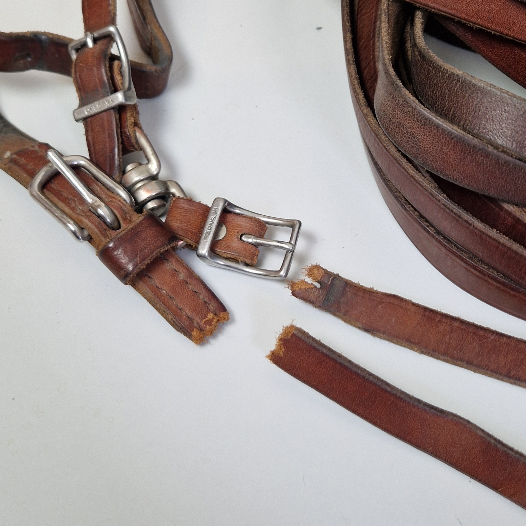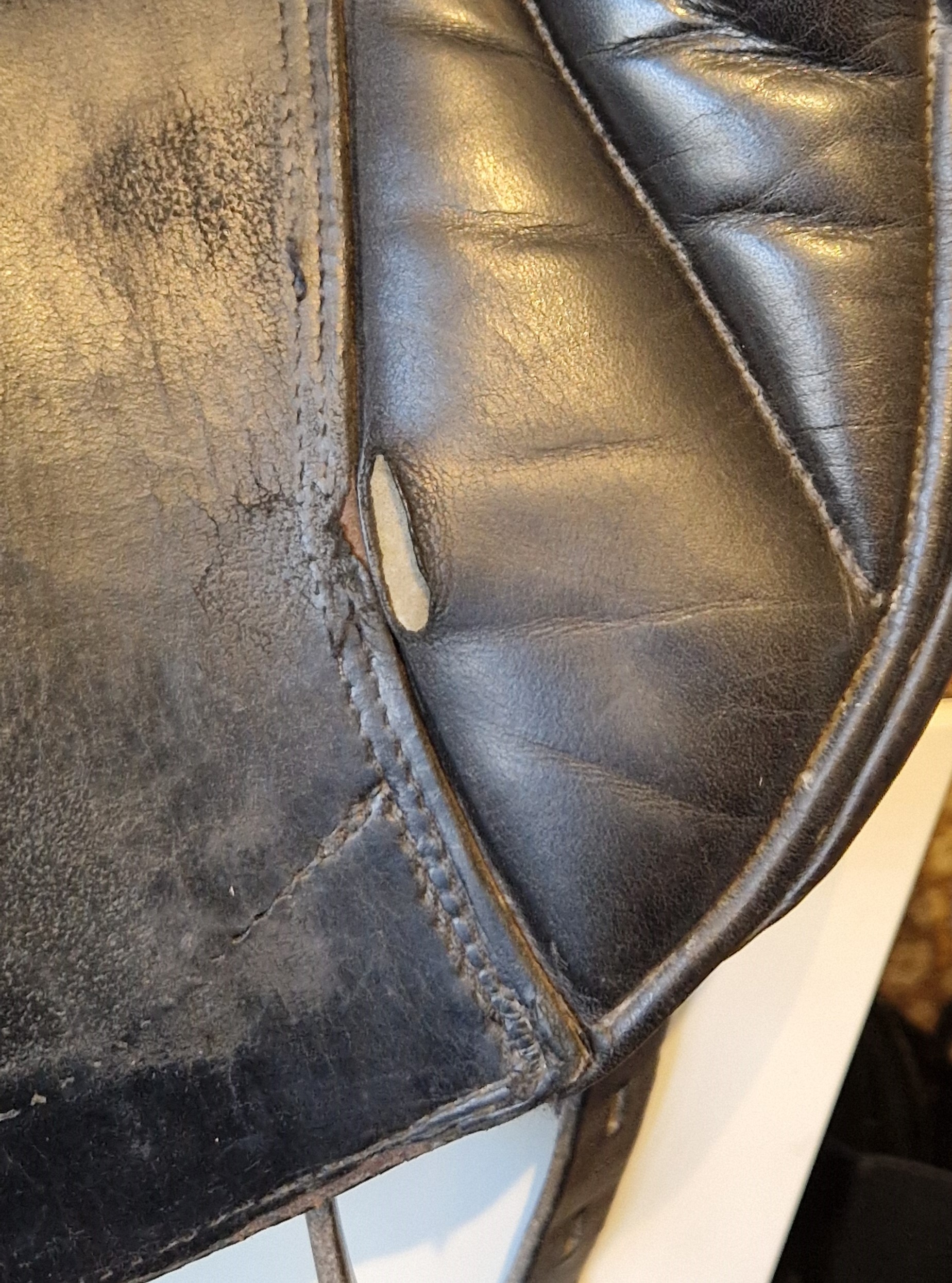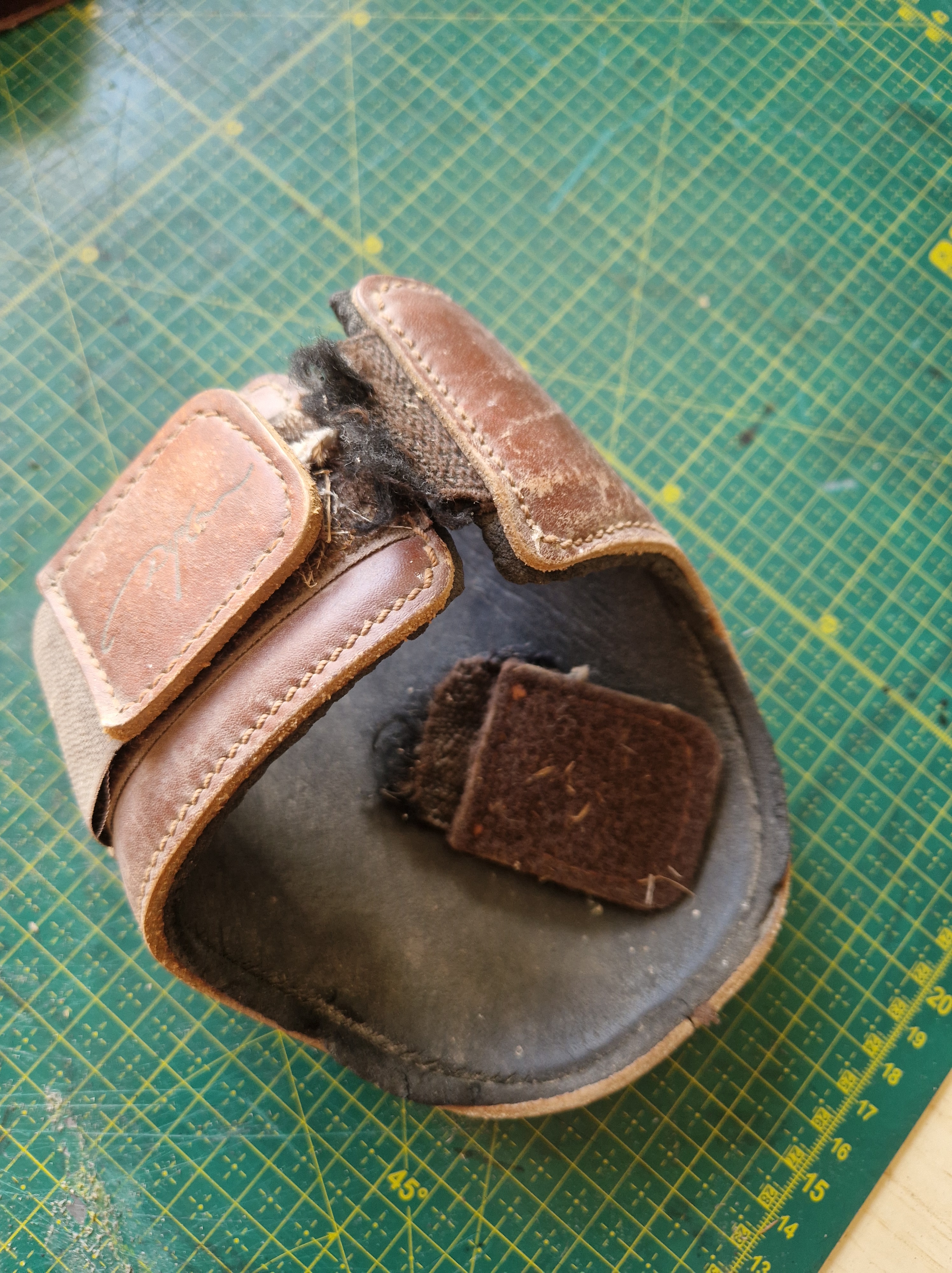 Bakbenskydd. Lagades och ändrades till en rem med enbart läder, för att kunna användas på unghäst på tävling