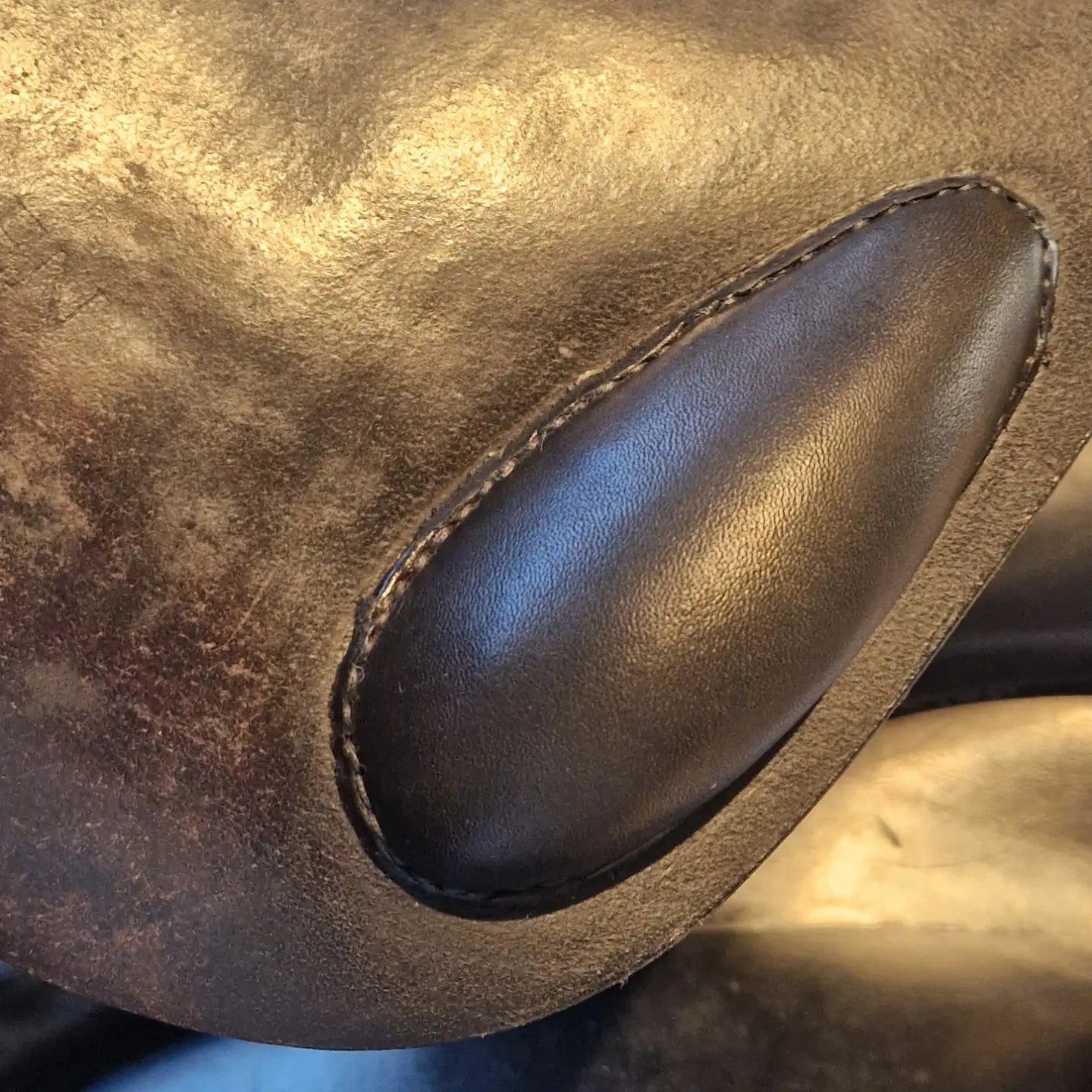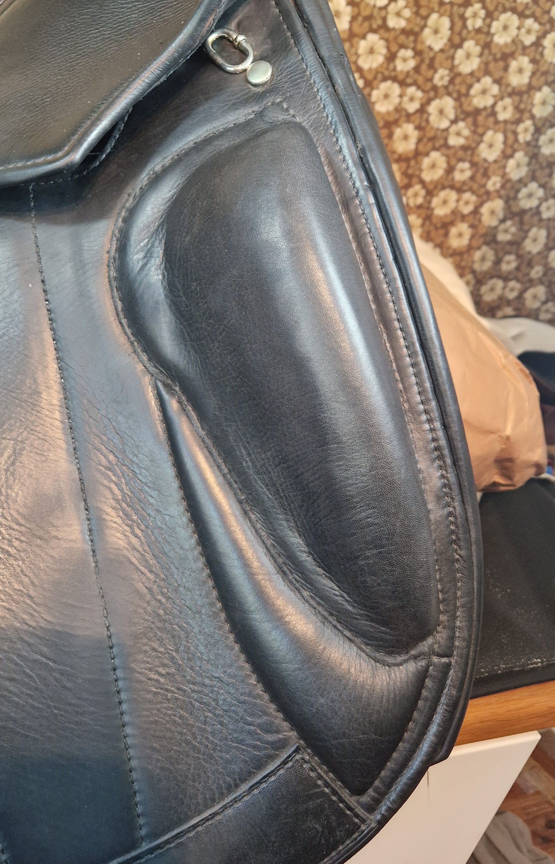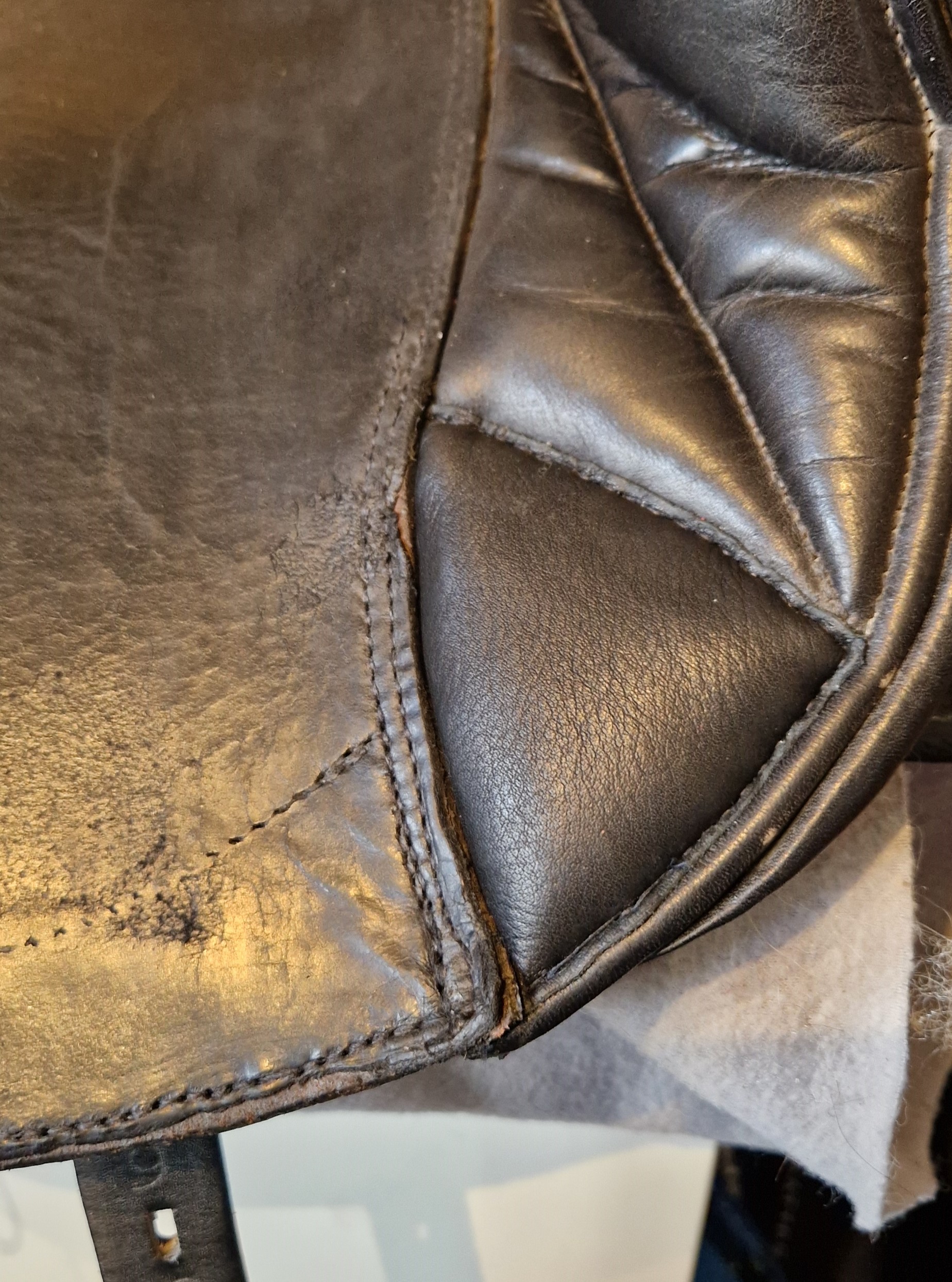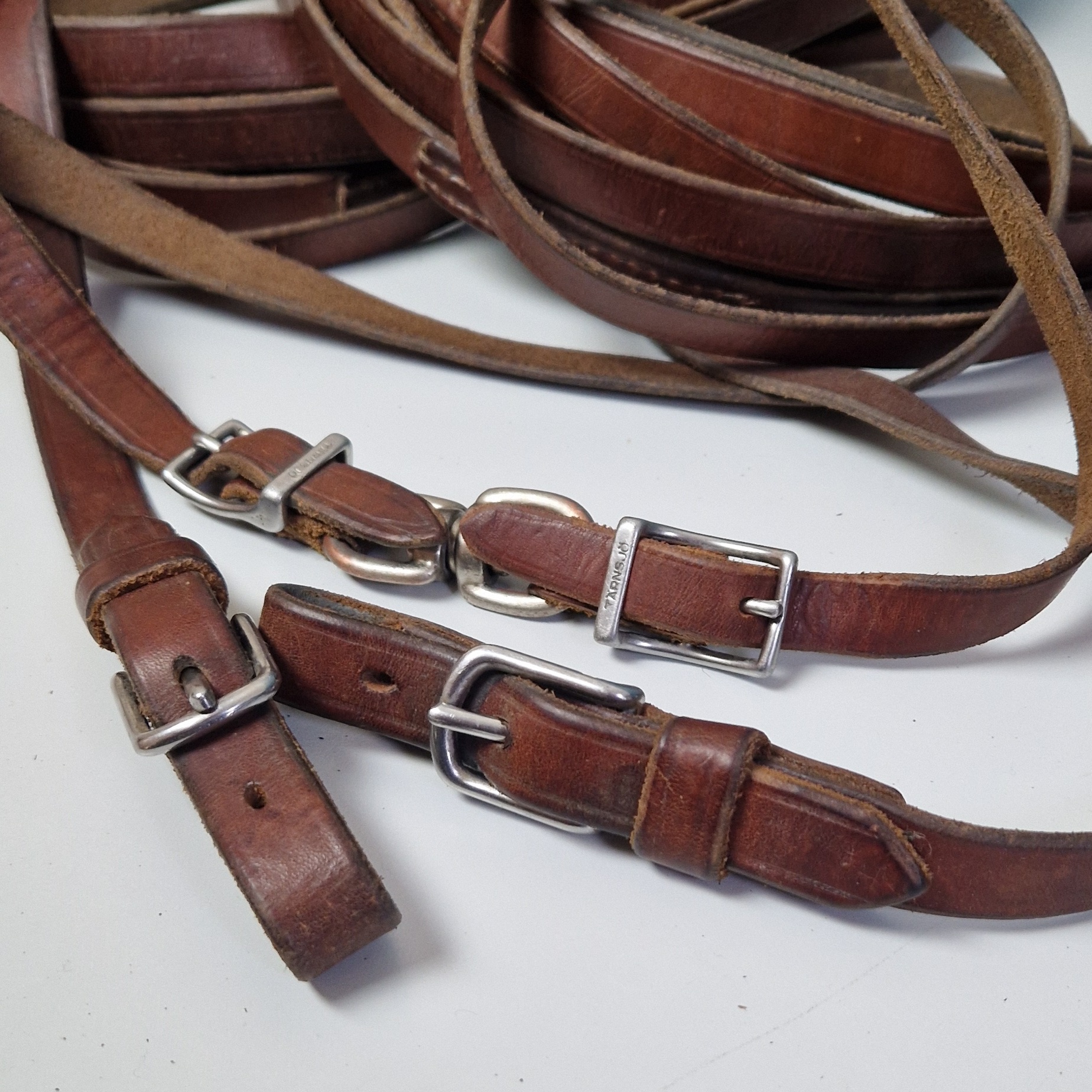 Bakbenskydd. Lagades och ändrades till en rem med enbart läder, för att kunna användas på unghäst på tävling