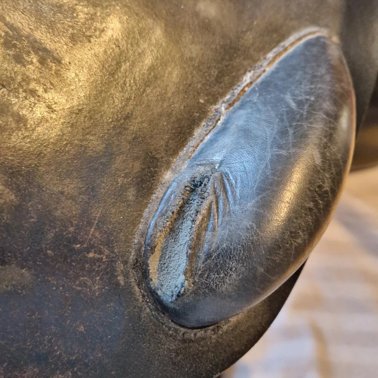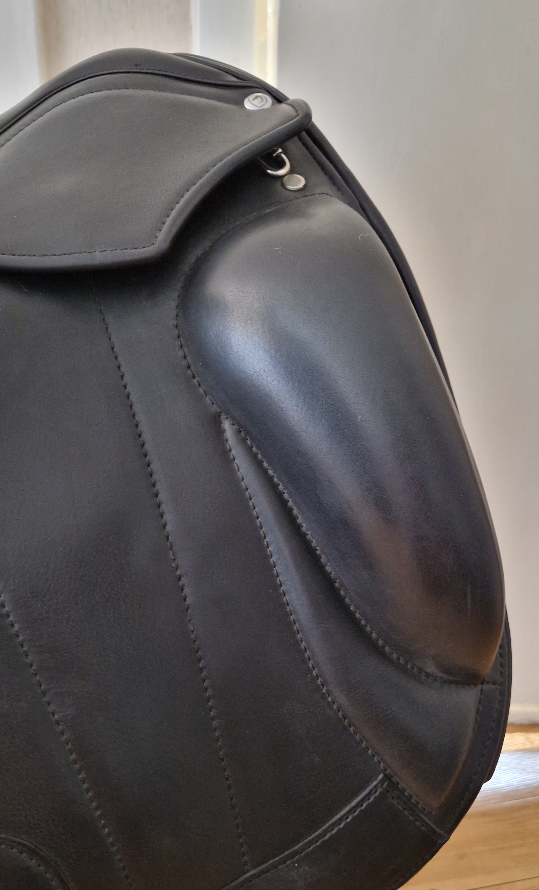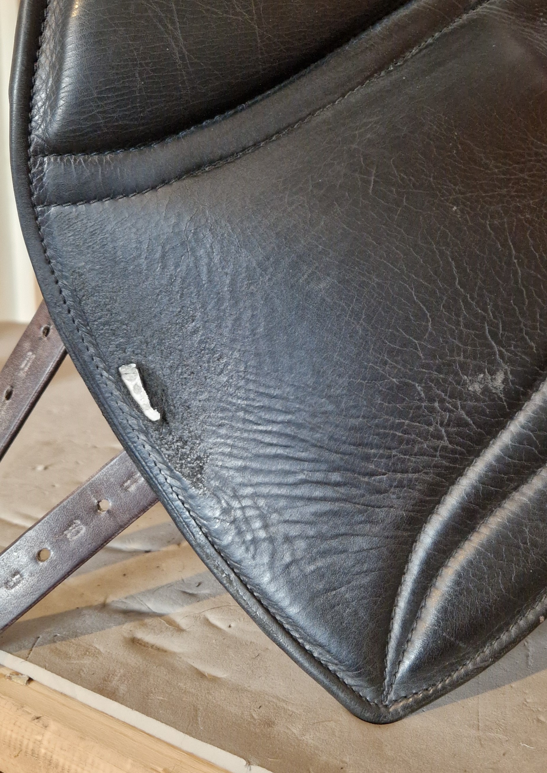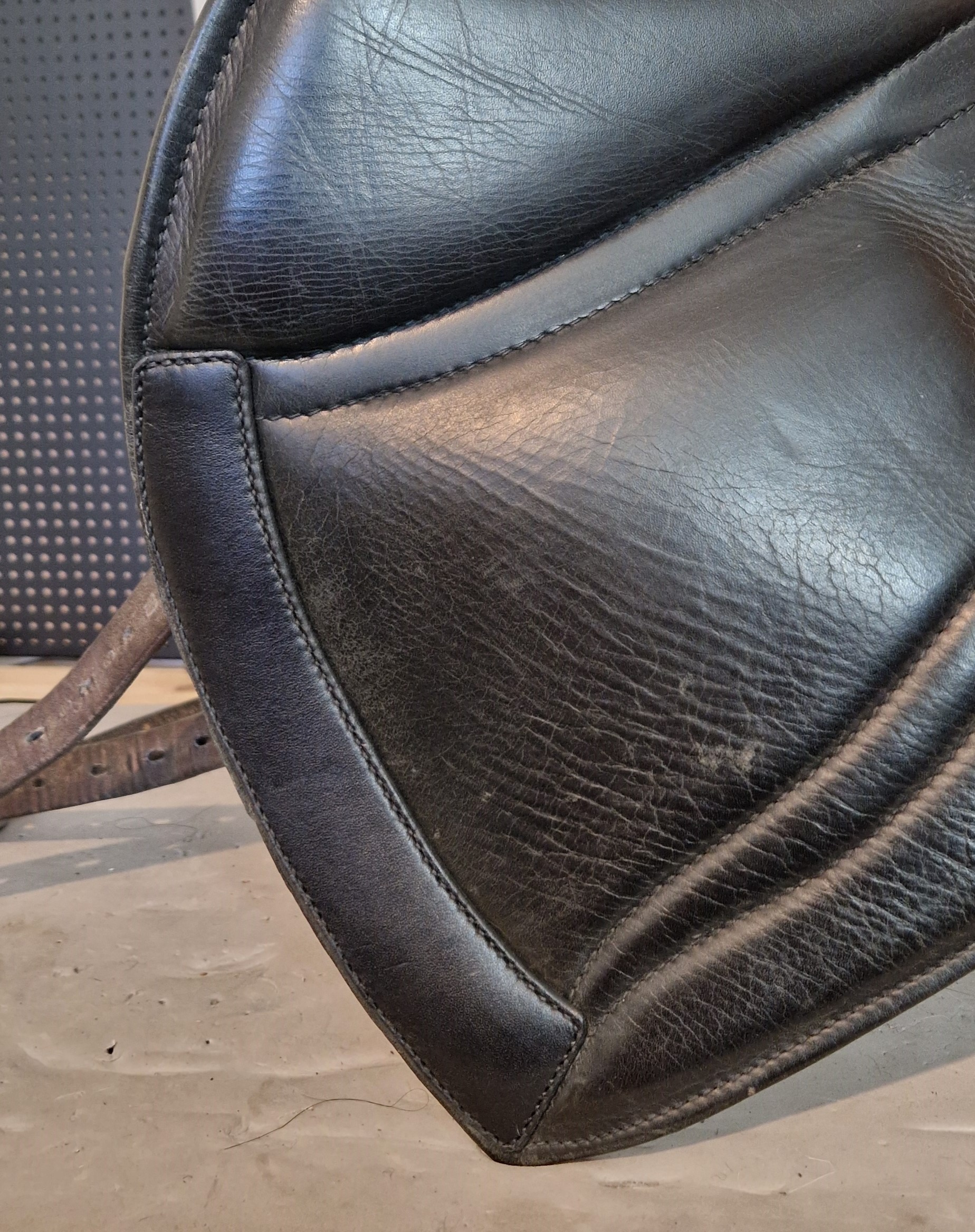 Bakbenskydd. Lagades och ändrades till en rem med enbart läder, för att kunna användas på unghäst på tävling
