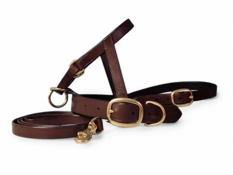 Set med nosgrimma, halsband och koppel för hund.